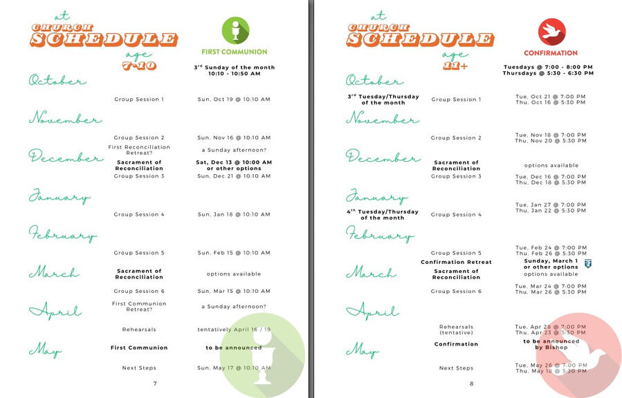 • Confirmation: the choice of Tuesdays (7-8 PM) or Thursdays (5:30-6:30 PM) (3rd week of each month until Dec, then 4th week of each month starting in Jan.)The full schedule is also found in the Information Booklet (updated Sept 30, 2025)